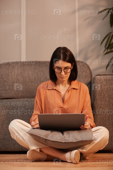 Деловая женщина, сидящая с пересеченными ногами на ноутбуке