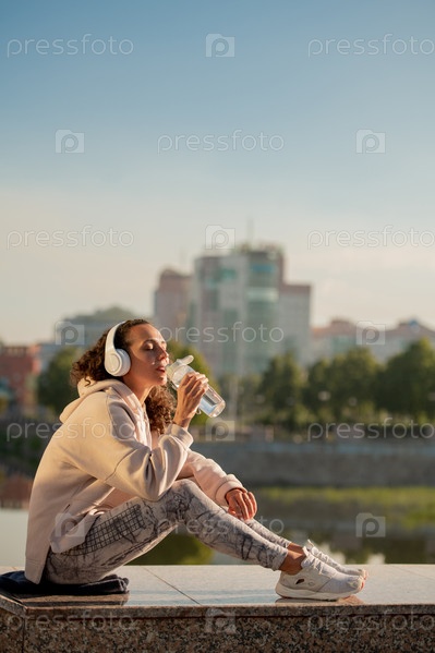 Отдыхающая жаждущая женщина в спортивной одежде пьет воду из бутылки на берегу реки