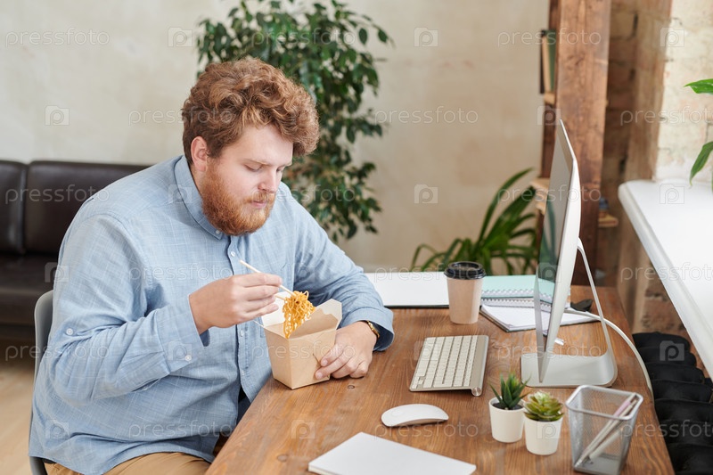 Серьезный жирный молодой офисный работник-мужчина с рыжими волосами, сидящий за столом с современным компьютером и ест лапшу из коробки