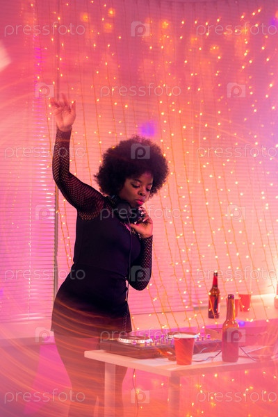 Молодая девушка-диджей африканской этнической принадлежности с наушниками, слушающая музыку