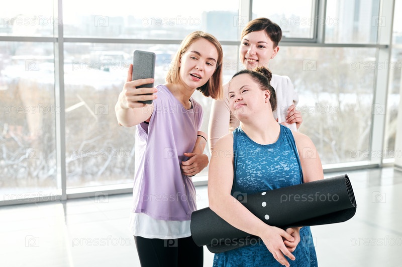 Счастливый молодой инструктор по фитнесу и две активные женщины делают селфи в тренажерном зале