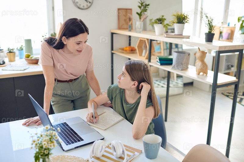 Молодая мать наклоняется над столом, где учится ее дочь-подросток