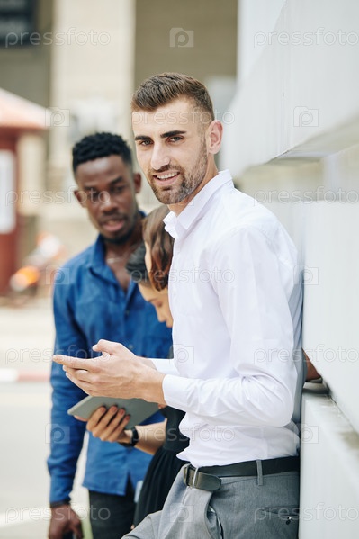Молодой привлекательный бизнесмен с планшетным компьютером