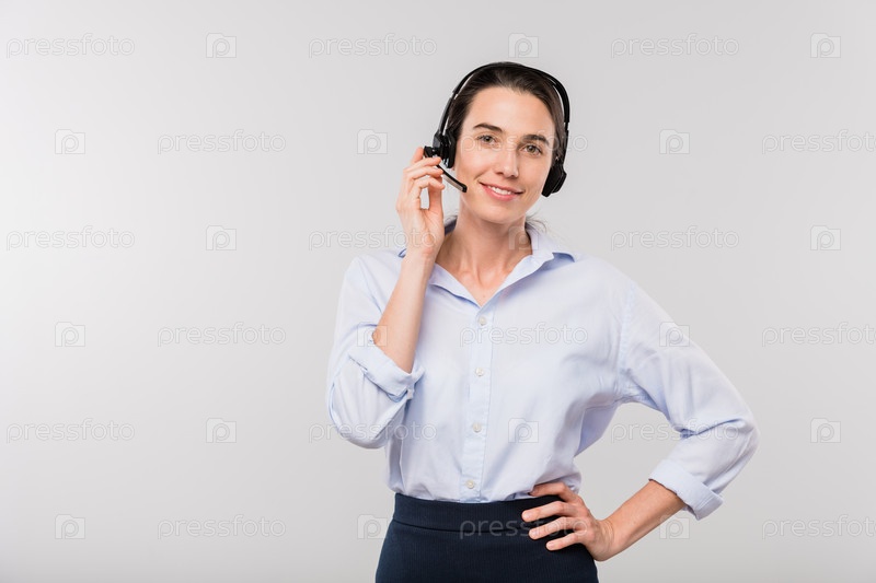Молодая улыбающаяся деловая женщина в гарнитуре консультирует клиентов по телефону
