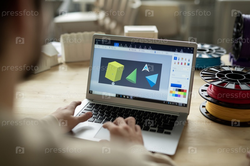 Геометрические формы на дисплее ноутбука и руки творческого дизайнера, работающего