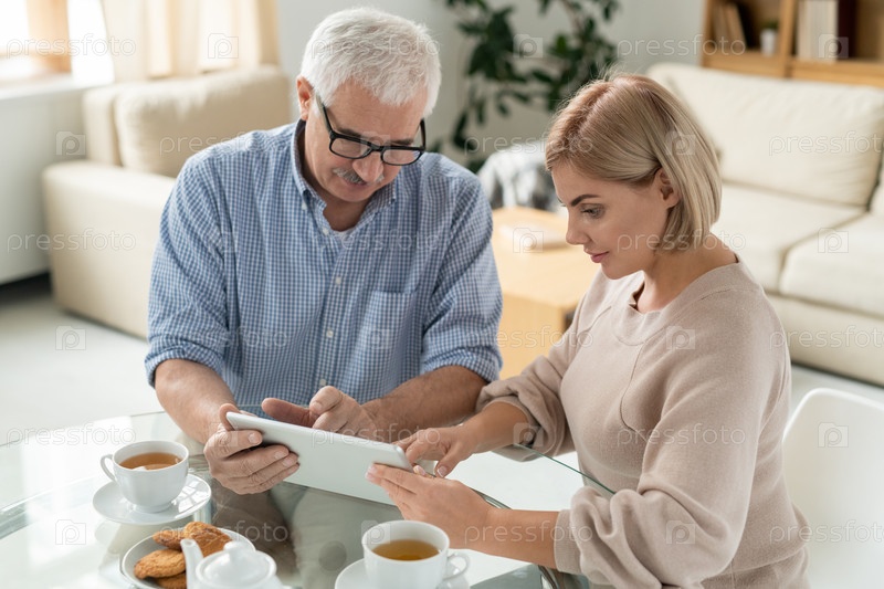 Пенсионер и его маленькая дочь показывают на сенсорный экран во время дискуссии