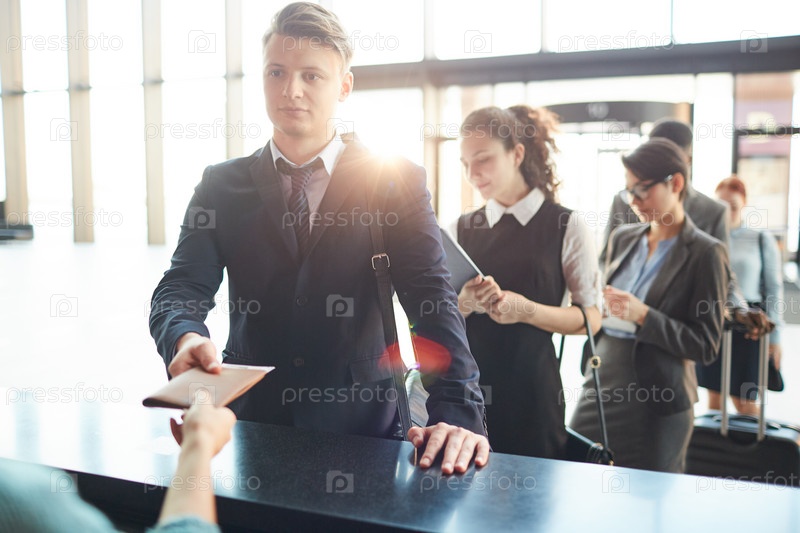 Бизнесмен выдает паспорт во время прохождения регистрации на рейс