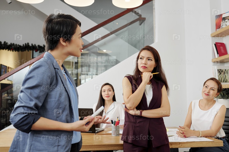 Деловые люди обсуждают во время презентации