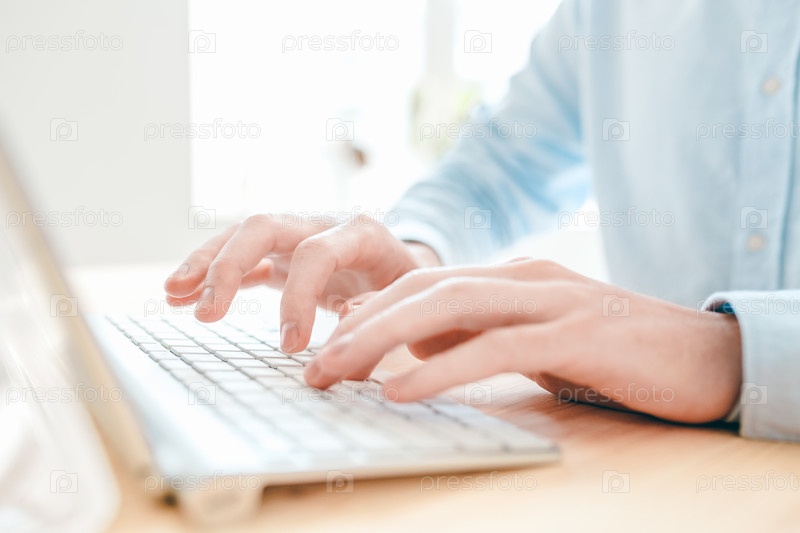 Руки молодого аналитика или дизайнера, печатающего за столом перед компьютером