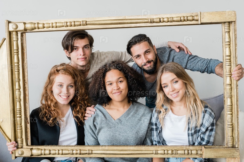 Группа молодых ласковых друзей-подростков, держащих большую раму