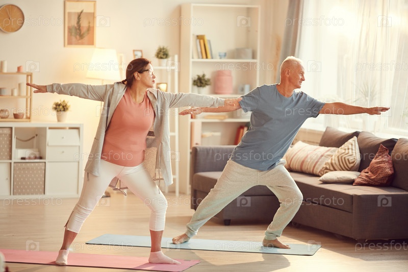 Активная зрелая пара в спортивной одежде стоит на тренажерных ковриках в гостиной и протягивает руки, практикуя вместе йогу