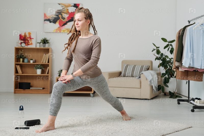 Молодая босоногая женщина в спортивной одежде растягивает ноги во время упражнений на ковре