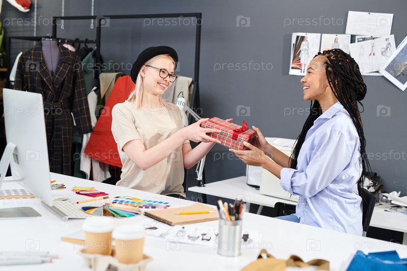 Женщина дарит подарок коллеге