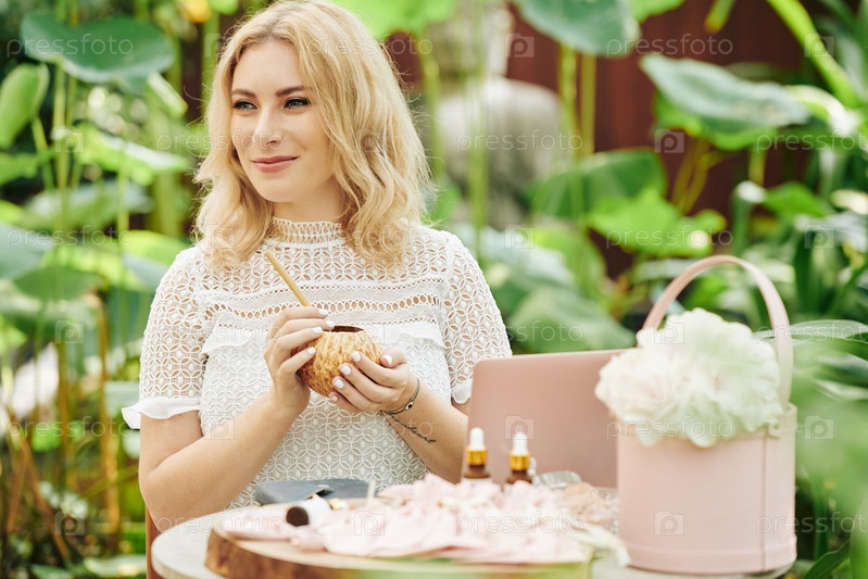 Женщина наслаждается сладким кокосовым молоком