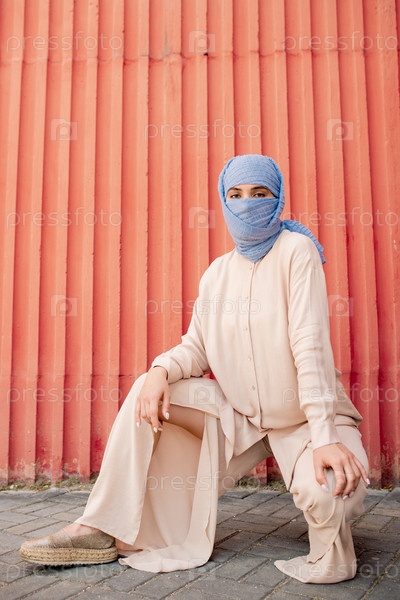 Молодая мусульманская женщина с хиджабом, скрывающим лицо и повседневной одеждой