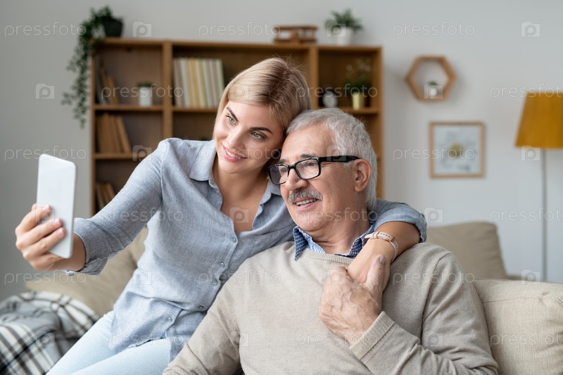 Счастливая молодая женщина со смартфоном обнимает старшего отца, делая селфи