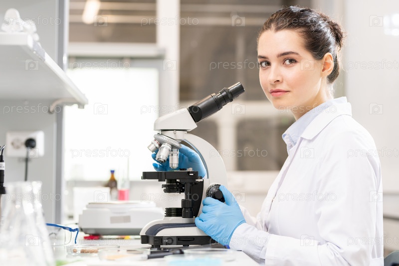 Молодая леди изучает бактерии в лаборатории