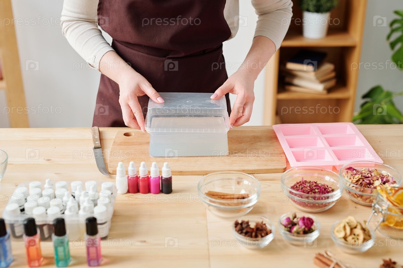 Молодая креативная женщина вынимает кусок твердой мыльной массы из пластикового контейнера