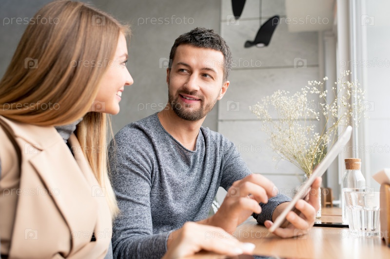 Счастливый молодой бизнесмен с планшетом и его коллега консультирующий на встрече