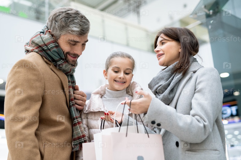 Молодая женщина открывает один из бумажных пакетов, показывая подарки для родственников