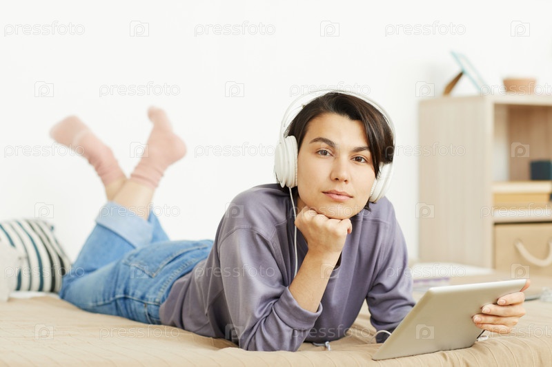 Портрет серьезной красивой девушки в проводных наушниках, лежащей на кровати и опирающейся головой на руку во время серфинга по социальным сетям на планшете