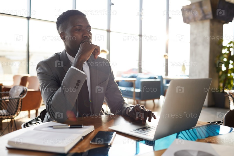 Вдумчивый чернокожий бизнесмен проверяет отчет