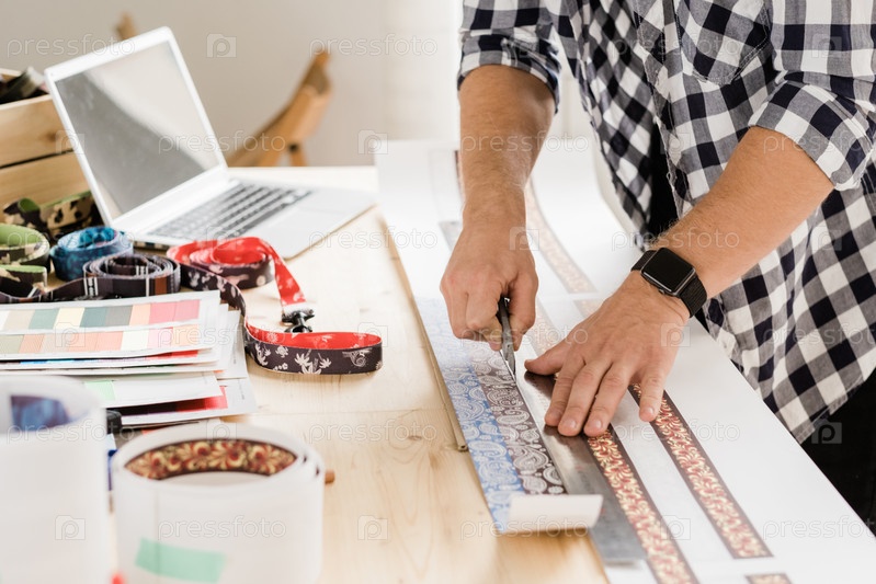Молодой обычный ремесленник с ножом и линейкой, разрезающий декоративные заготовки