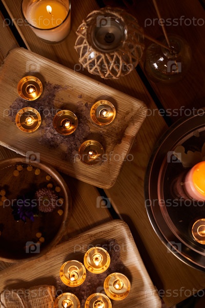 Прямо сверху вид на ароматные свечи на деревянных опорах и ароматическую палку, используемую для расслабляющей атмосферы в спа-салоне