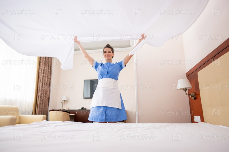 Счастливая молодая горничная в униформе и фартуке, держащая белое свежее белье над кроватью