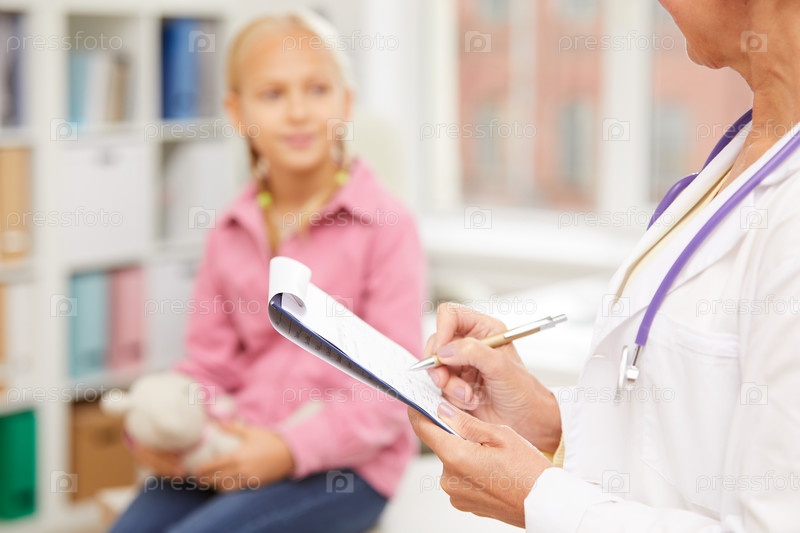 Близкий план неузнаваемого врача в лабораторном халате, заполняющего форму маленьких пациентов на щитке при разговоре с ребенком во время назначения