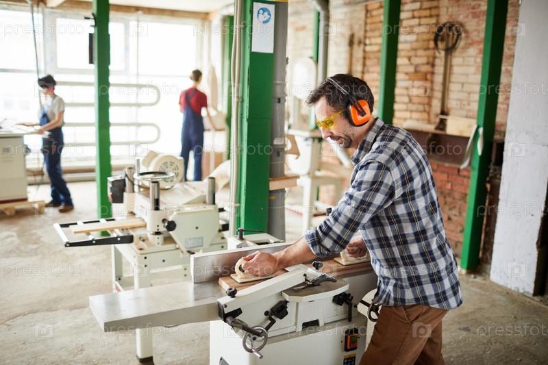 Плотник, использующий деревообрабатывающие машины в мастерской