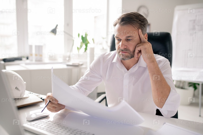 Зрелый мыслящий инженер смотрит на эскиз, думая об идеях или проверяя их