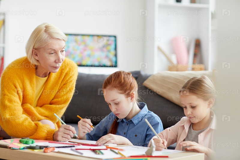 Зрелая женщина рисует с двумя детьми