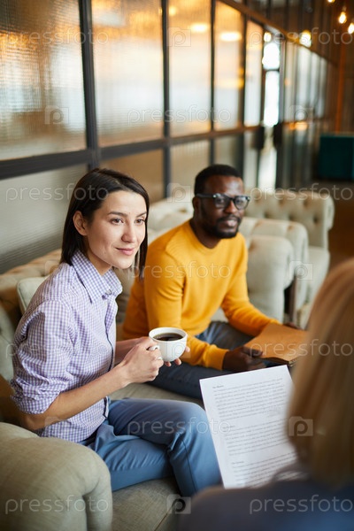 Непризнанная леди объясняет контракт молодым коллегам, пока они встречаются в современном кафе, молодые мультиэтнические люди внимательно слушают женщину