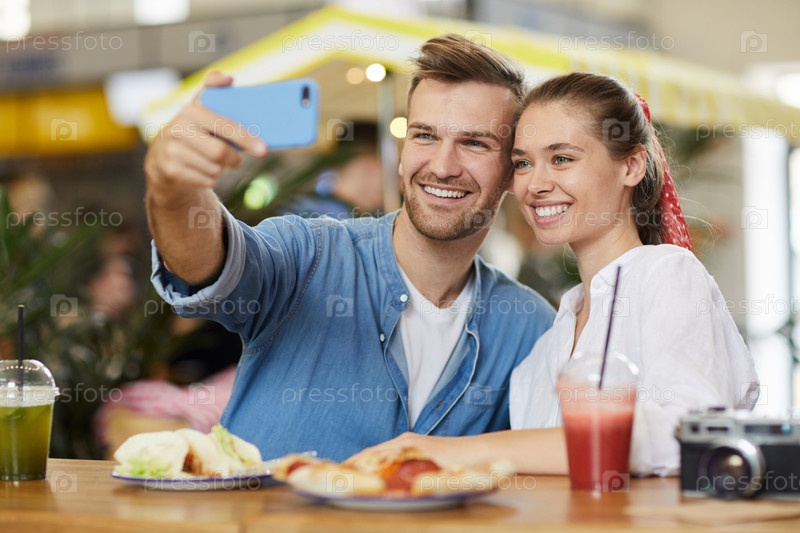 Веселая молодая пара в повседневной одежде сидит за столом и делает селфи в кафе