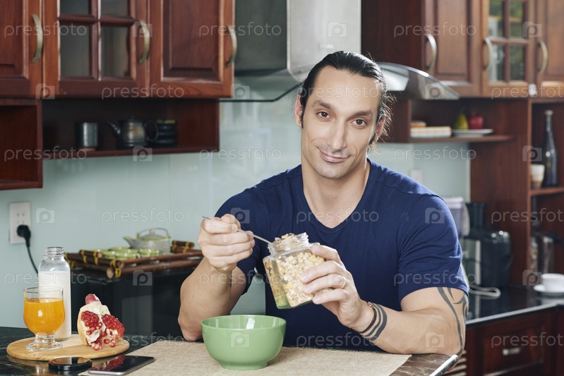 Мужчина ест здоровый завтрак