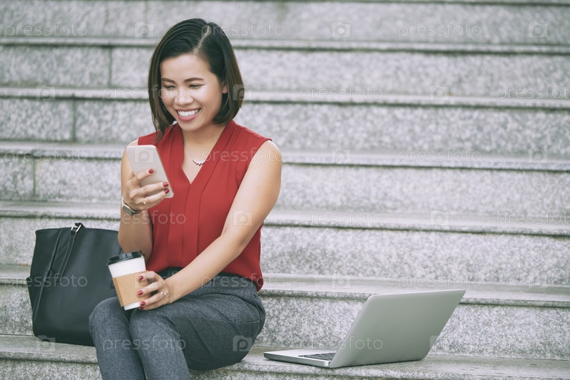 Женщина, использующая мобильный телефон во время перерыва на кофе