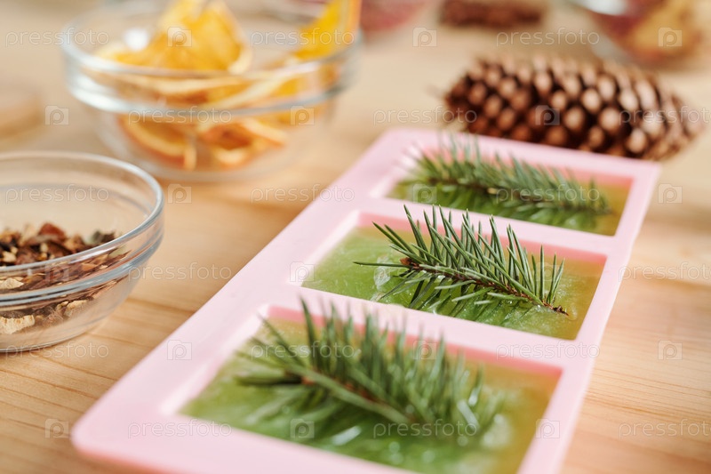 Ручно сделанное зеленое мыло из хвойных деревьев и стеклянной посуды с ароматическими ингредиентами