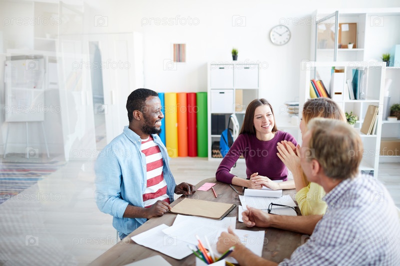 Группа позитивных мультиэтнических дизайнеров в повседневной одежде, сидящих за столом и обсуждающих проект на встрече