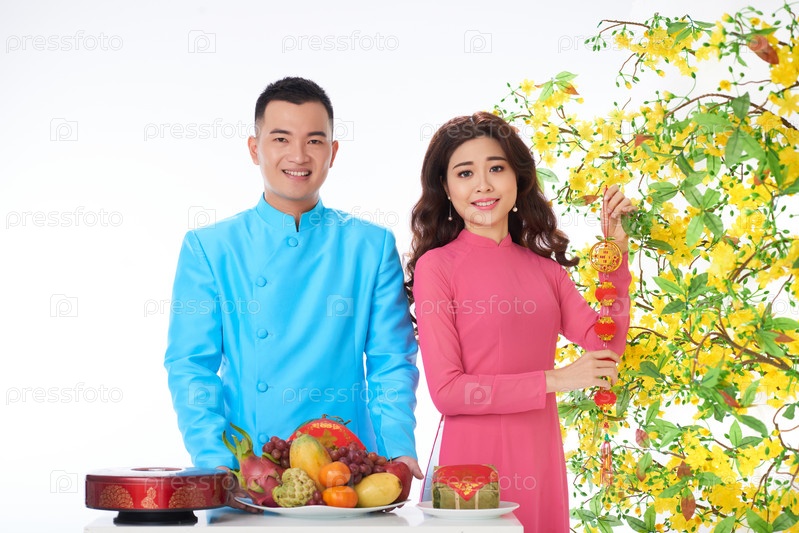 Счастливая пара, празднующая Тет