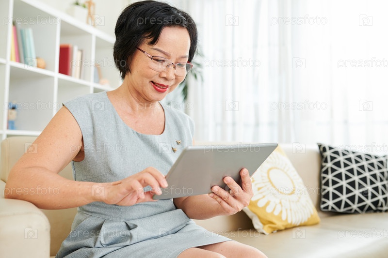 Женщина, использующая планшетный компьютер дома