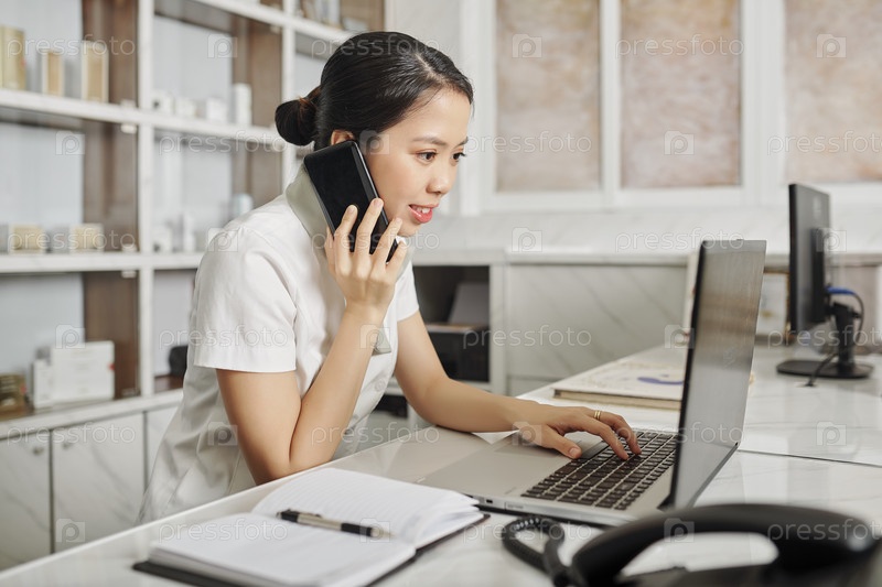 Рецепсионистка проверяет график и отвечает на телефонные звонки