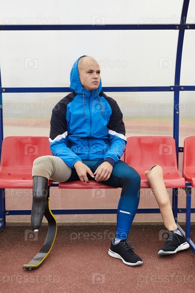 Серьезный молодой лысый парень с бегущим лезвием, одетый в джинсы с капюшоном и спортивные леггинсы сидит на скамейке, его протезирующая нога в кроссовках опирается на кресло