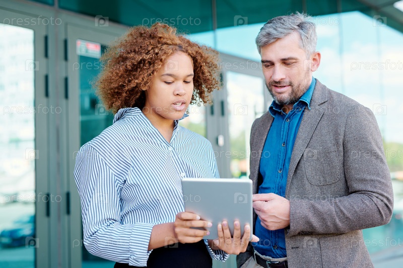 Молодая межкультурная бизнесвумен и ее коллега-мужчина обсуждают онлайн-данные