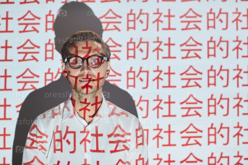 Улыбающийся умный молодой человек в очках стоит на проекционном экране и дает презентацию по-китайски