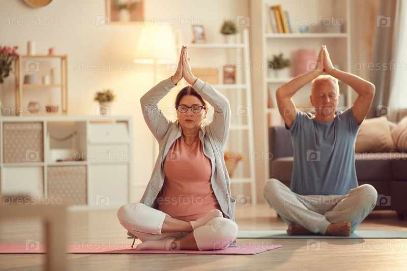 Серьезные пожилые пары сосредоточились на мыслях, сидя с перекрещенными ногами и поднимая руки в жест 'Намасте' во время медитации дома