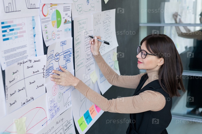 Уверенный экономист анализирует финансовую информацию на доске в офисе