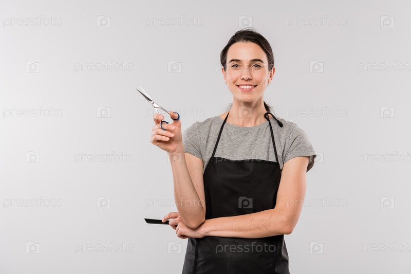 Довольно молодая улыбающаяся парикмахерша с щеткой и ножницами смотрит на тебя