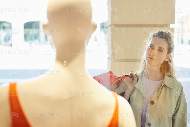 Вдумчивая девушка смотрит на одежду в магазине