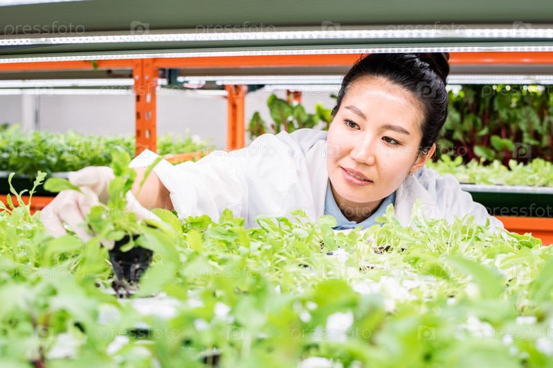 Молодая азиатская биолог-женщина проводит исследования новых видов растений в теплицах
